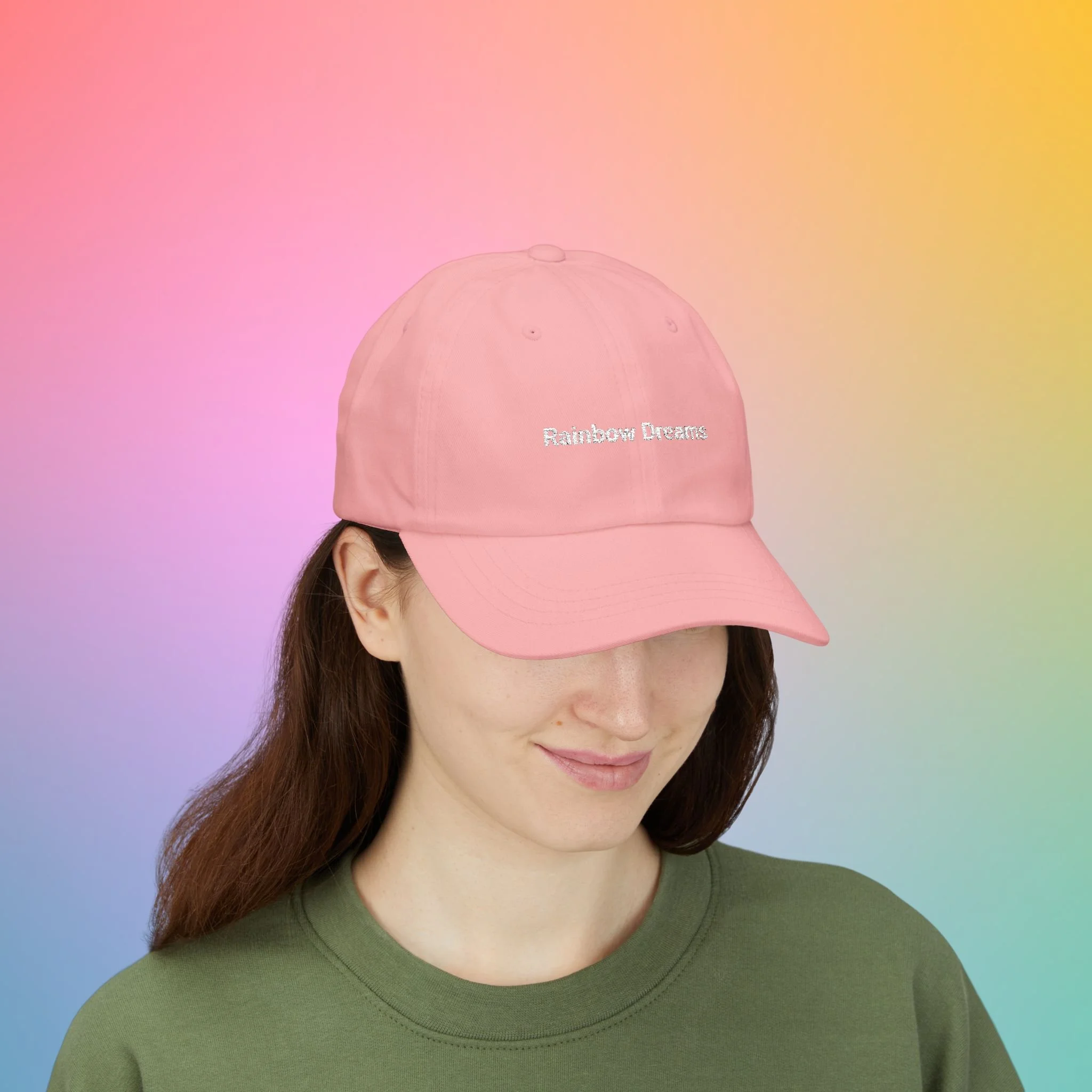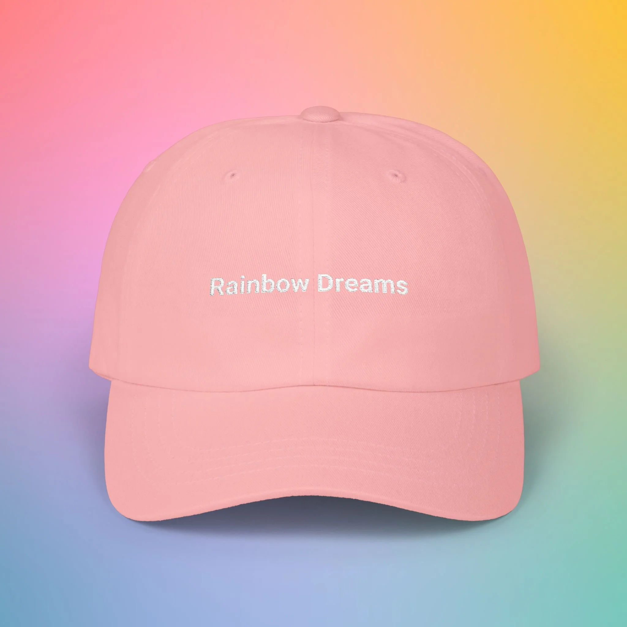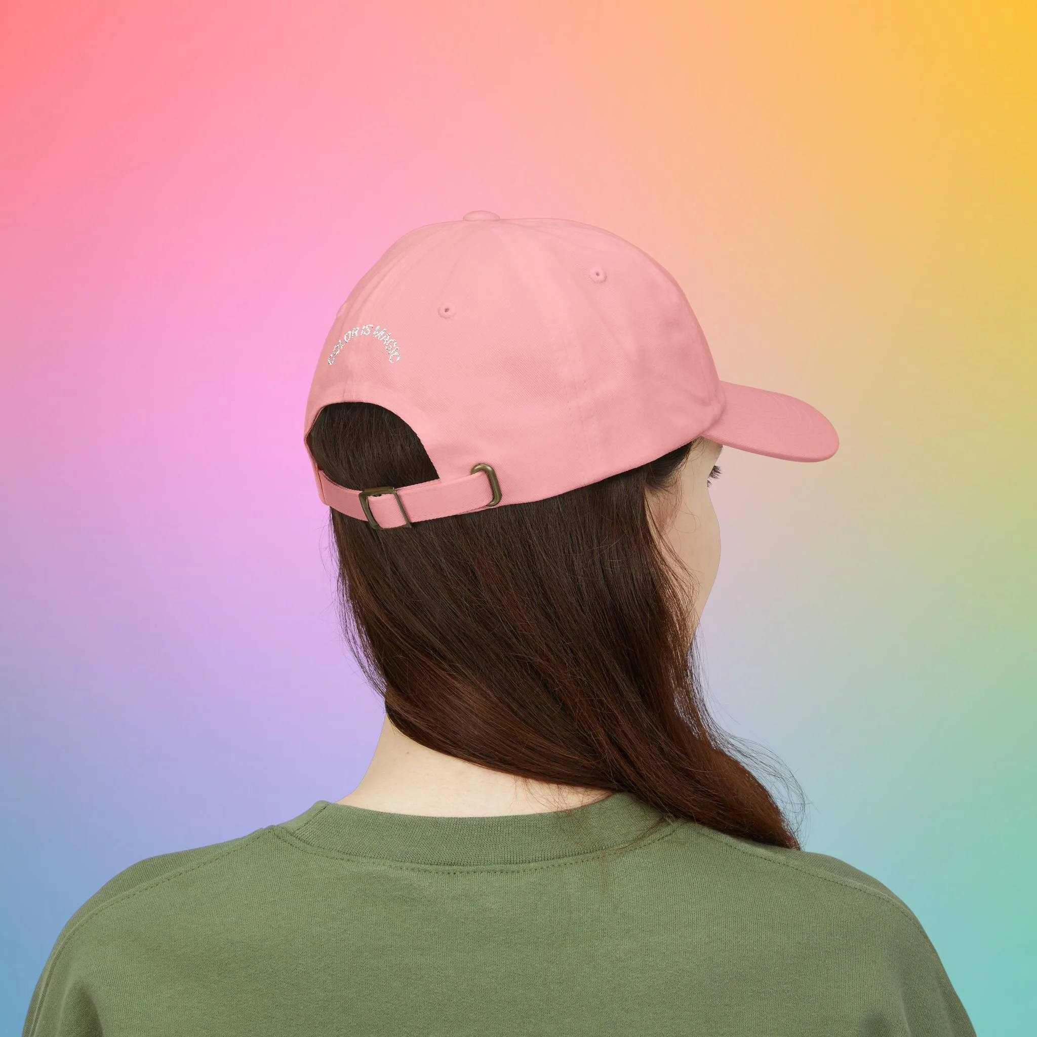 A soft, low-profile dad cap in a gentle pink shade, embroidered with sweet, hand-lettered messages: “Rainbow Dreams” on the front and a small curved “color is magic” above the back opening. It feels broken-in from the first wear thanks to the unstructured 6-panel body and pre-curved Permacurv® visor. The underbill matches the cap color for a clean, cohesive look. An antique brass buckle and hideaway strap let you fine-tune the fit, while subtle details like sewn-in label and brand sticker on the visor give it a crafted, wearable quality. Lightweight 100% cotton (with select camo color containing polyester) keeps breathability high for everyday strolls, coffee runs, and slow afternoons in the sun.