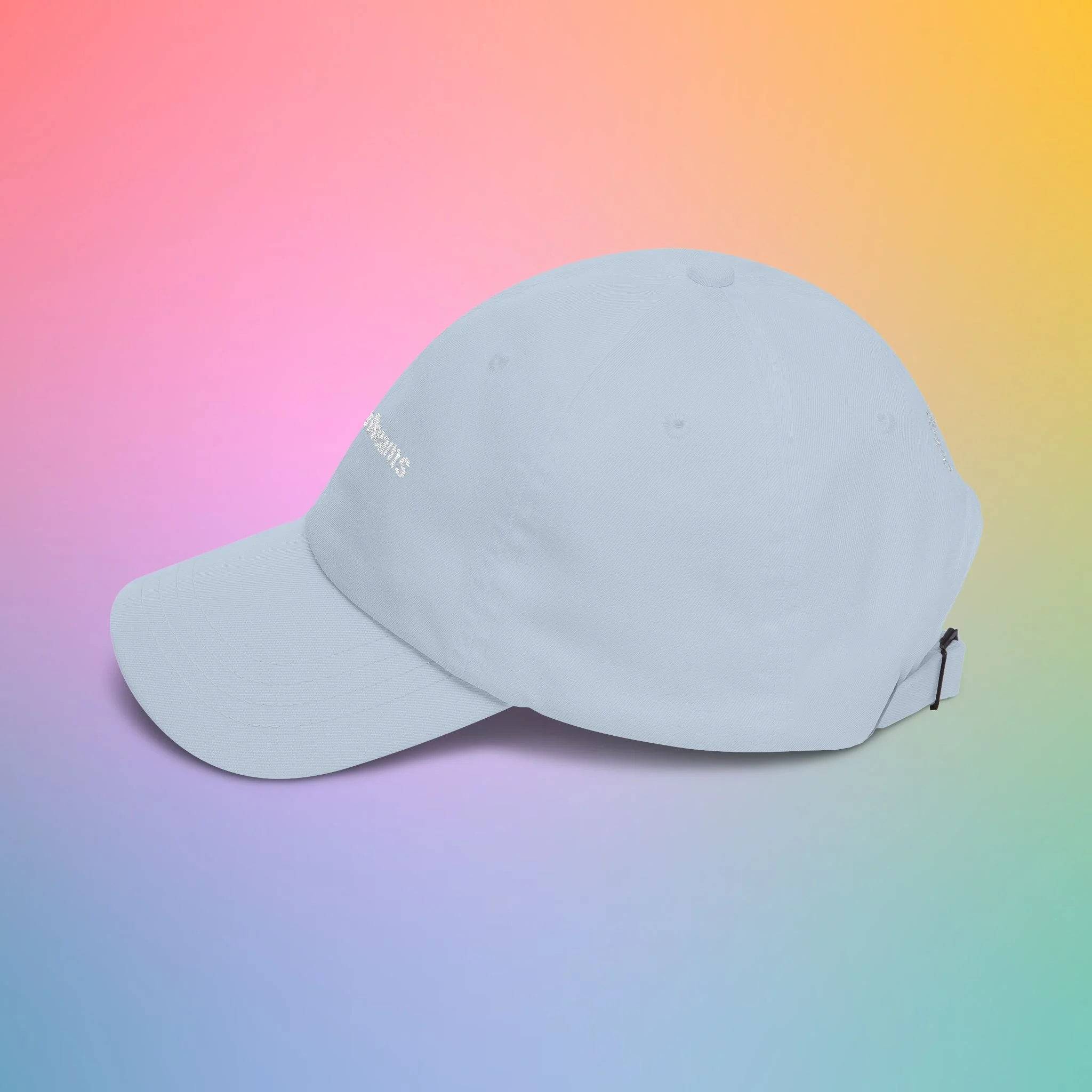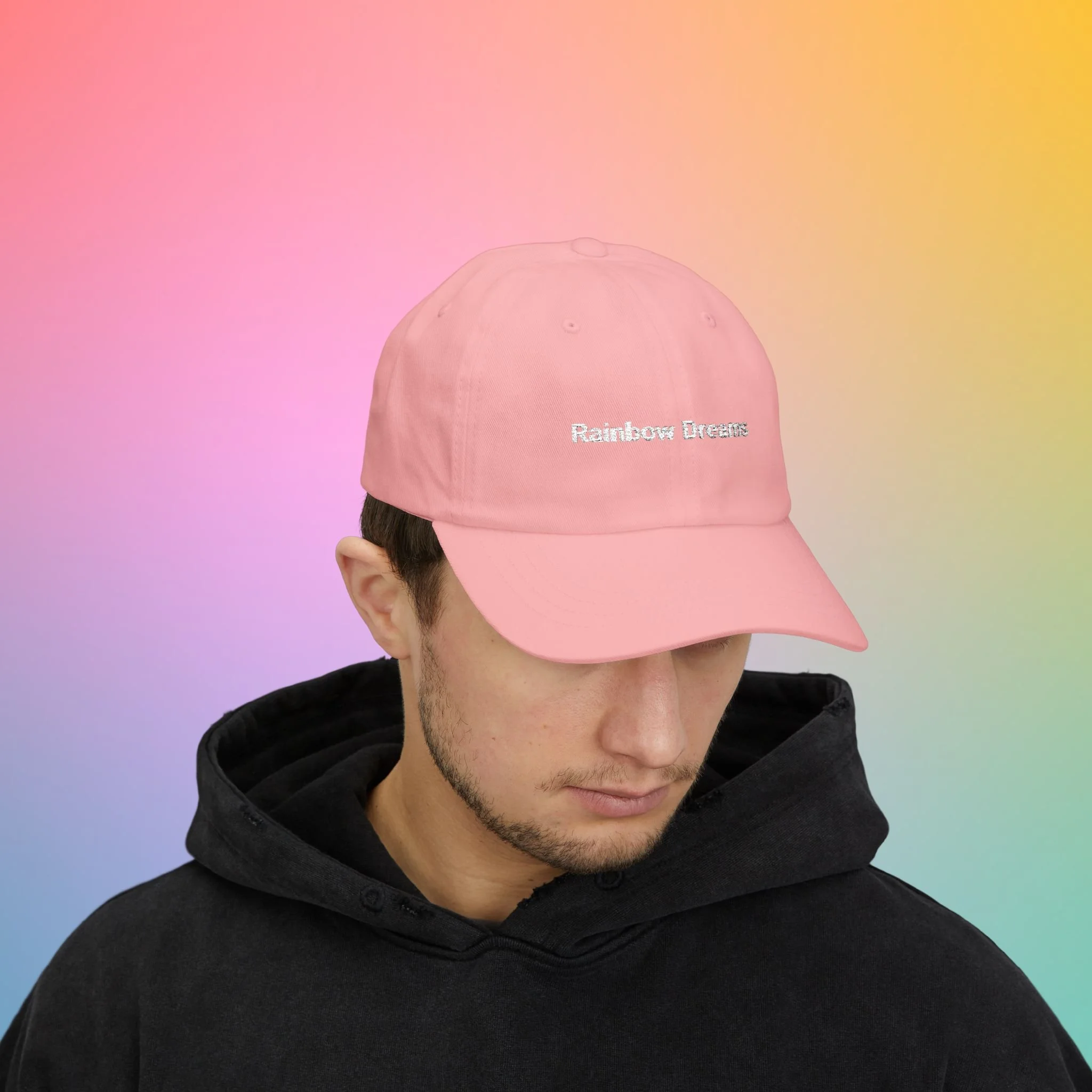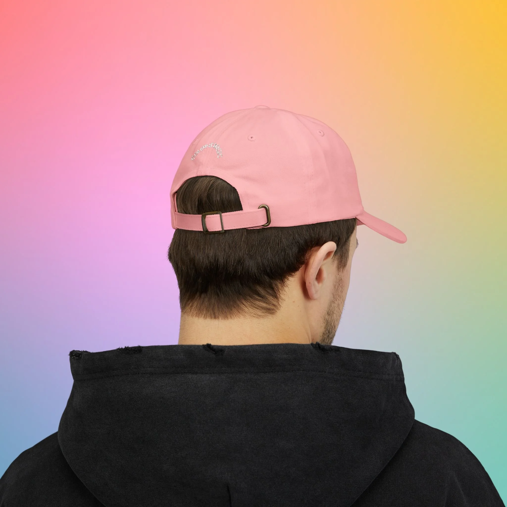 A soft, low-profile dad cap in a gentle pink shade, embroidered with sweet, hand-lettered messages: “Rainbow Dreams” on the front and a small curved “color is magic” above the back opening. It feels broken-in from the first wear thanks to the unstructured 6-panel body and pre-curved Permacurv® visor. The underbill matches the cap color for a clean, cohesive look. An antique brass buckle and hideaway strap let you fine-tune the fit, while subtle details like sewn-in label and brand sticker on the visor give it a crafted, wearable quality. Lightweight 100% cotton (with select camo color containing polyester) keeps breathability high for everyday strolls, coffee runs, and slow afternoons in the sun.